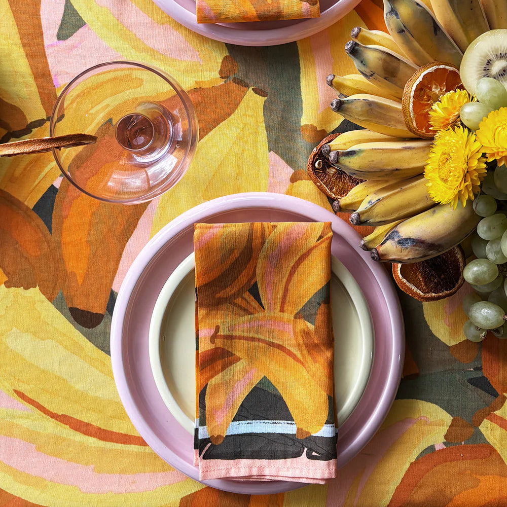 A fun banana print, perfect for summer. A colourful and practical garnish for the table. Intended to mix and match, designed to be paired back with summer napkins and staple crockery from the home. Napkin set of 4.